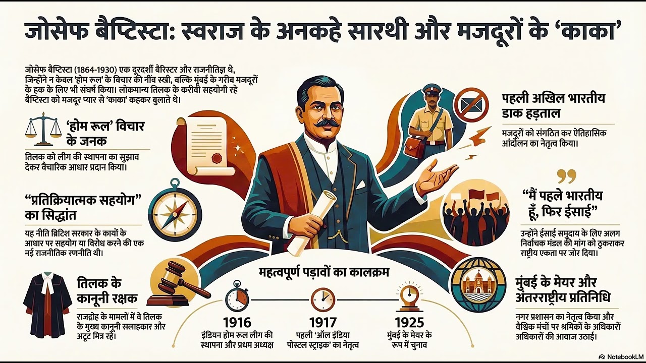 ભારતીય સ્વતંત્રતા સંગ્રામના ઇતિહાસના લોકમાન્ય ટિળક, મહાત્મા ગાંધી અને સરદાર પટેલ જેવા નામો તેજસ્વી તારાની જેમ ચમકે છે. પરંતુ એક વિસરાયેલું પણ અત્યંત પ્રભાવશાળી નામ એટલે જોસેફ બેપ્ટિસ્ટા (1864-1930). એક તેજસ્વી બેરિસ્ટર, દુરંદેશી રાજકારણી અને મુંબઈના ગરીબ મજૂરો માટે આશાનું કિરણ બનેલા 'કાકા'.